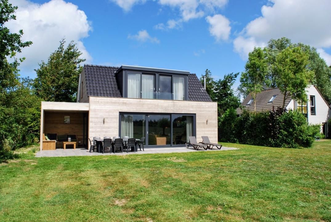 Vrijstaand luxe vakantiehuis gelegen aan de rand van het park Breezand 2. Groot tuinterras op het zuiden met een prachtig uitzicht over de landerijen. (Geen verhuur aan jongerengroepen of instellingen)